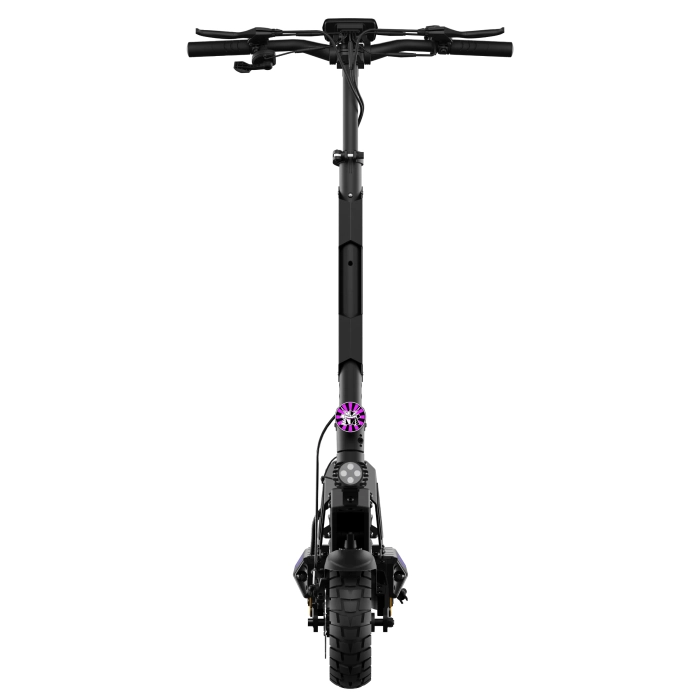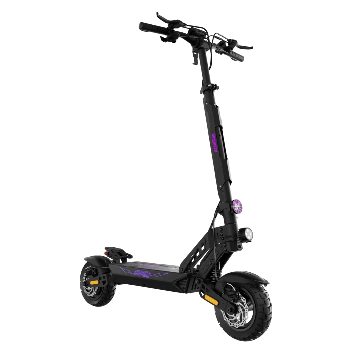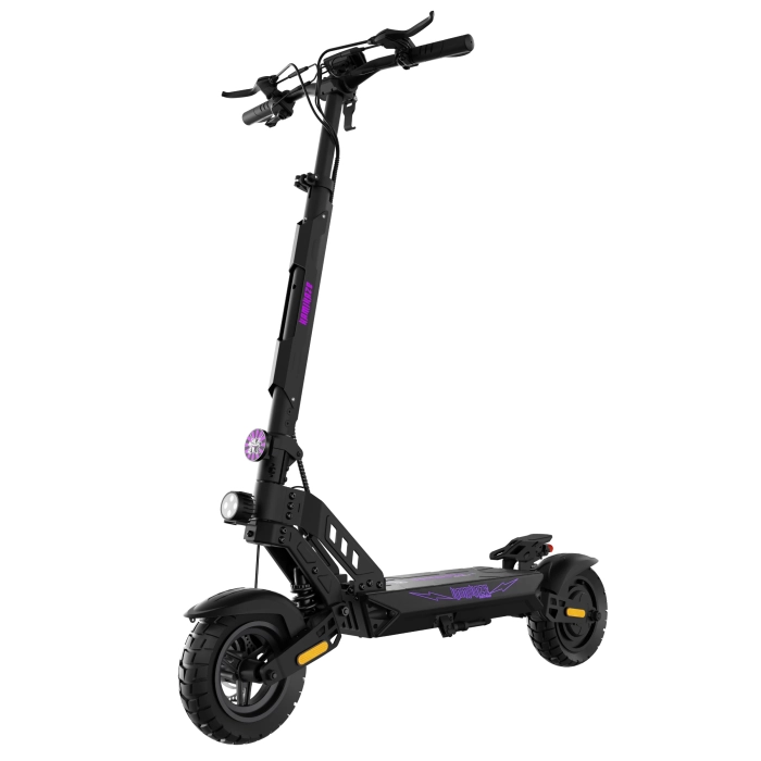 Hulajnoga elektryczna Kamikaze K1 Katana posiada silnik o mocy 1000 W, który zapewnia sprawne przyspieszenie. Ten model został dostosowany do zimowych warunków. Opony zimowe wraz z hamulcami tarczowymi i zawieszeniem sprężynowym skutkują większą przyczepnością i panowaniem nad pojazdem. Podświetlany podest LED RGB, którego barwę sam wybierasz, przednia lampa i kierunkowskazy są widoczne z daleka. Charakter tej hulajnogi podkreśla dodatkowo fioletowe logo na kolumnie, podeście i sygnet na czole. Blokada NFC zabezpiecza pojazd przed niepowołanym użyciem, a wbudowany AirTag pozwala go odnaleźć jeśliby miał zniknąć z oczu.